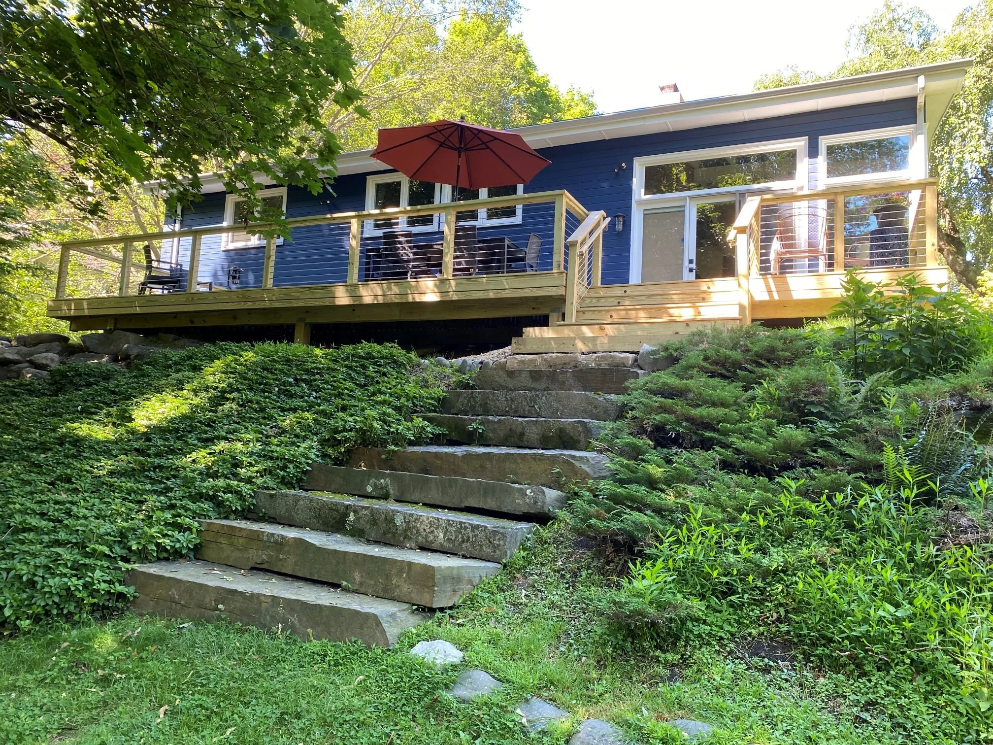 Blue house with a wooden deck, an umbrella, chairs, and sliding glass doors, situated on a green, wooded hillside with steps leading up to it.