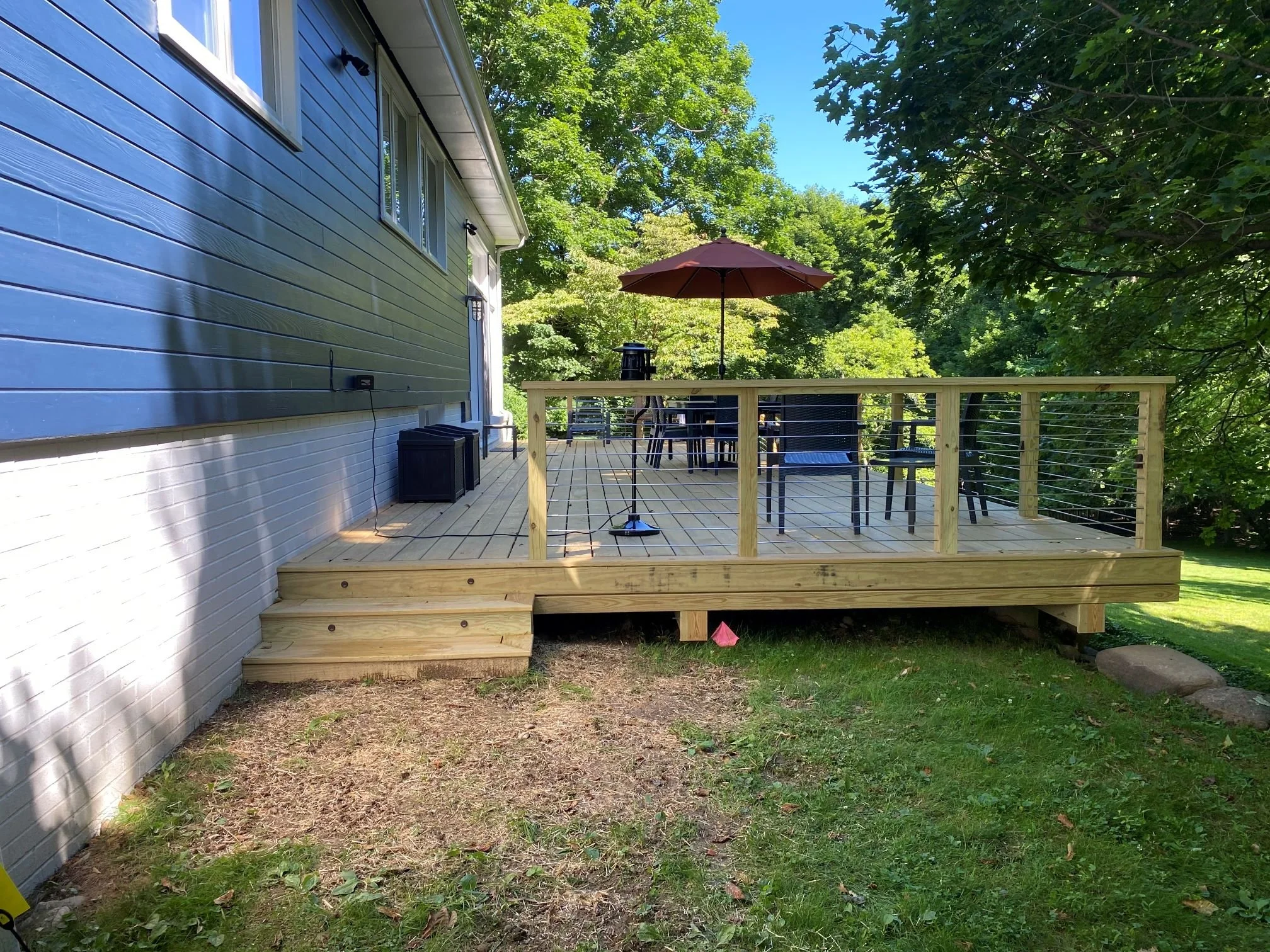 Backyard wooden deck attached to blue house with steps, surrounded by green trees and grass, with outdoor furniture and a large umbrella.