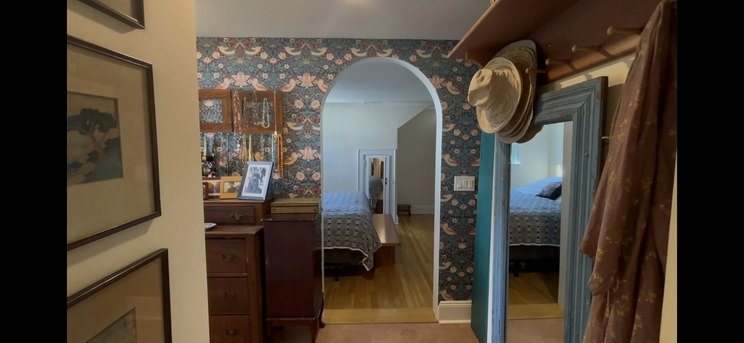 Interior view through an arched doorway showing a hallway with a closed black door at the end. On the left, there is a wooden coat rack with hats and a cardigan hanging, a framed artwork on the wall, a wicker basket on a small cabinet, and a wooden s