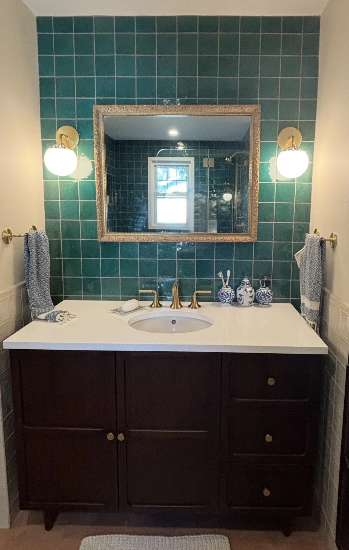 Bathroom vanity with dark wood cabinet, white countertop, oval sink, gold fixtures, large mirror, green tiled wall, wall sconces with round shades, decorative blue and white ceramic containers, and a window reflected in the mirror.